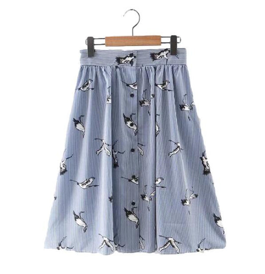 Women sweet birds print mid-calf striped skirts open stitch buttons design summer