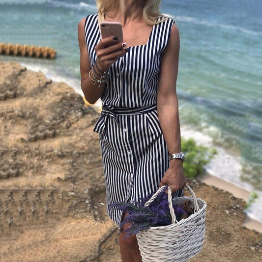 Women Stripe Shirt dress 2018 Summer New Square collar sleeveless belt Elegant dresses Pink Blue Stripe Beach Party Dress