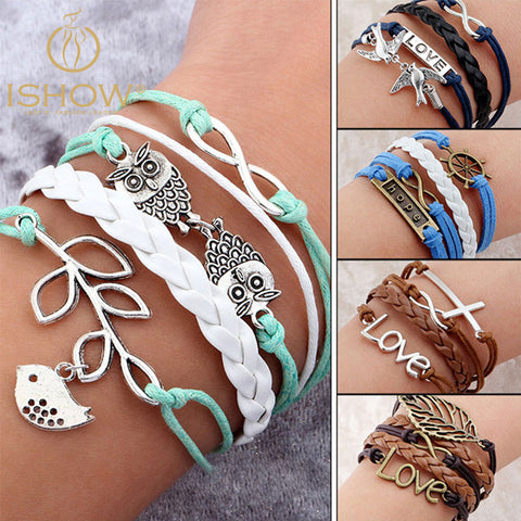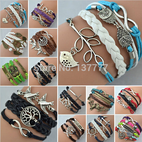 Hot Sale Fashion Vintage Bird Tree Owls Infinity Anchors Rudder Rope Bracelet Wrap Leather Bracelet Multilayer bracelets bangles