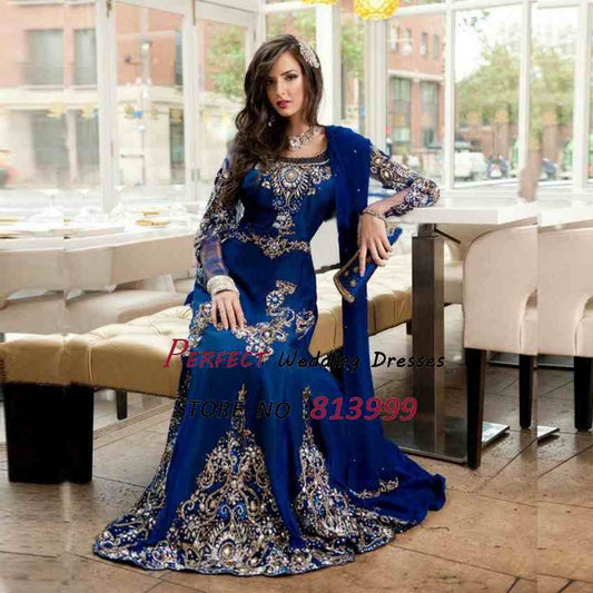2016 Stunning Royal Blue Beaded Muslim Evening Dress Long Sleeves Moroccan Kaftan