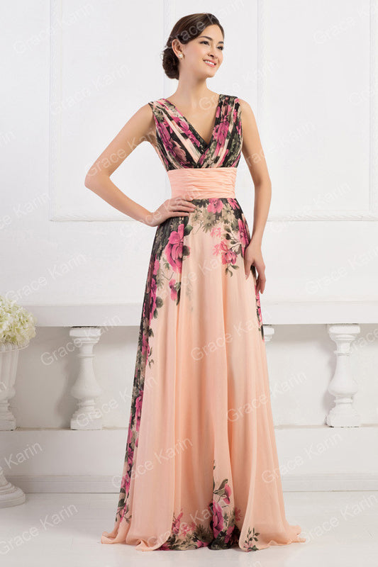 Elegant Women Vintage Plus Size Evening Dress Long with Flowers Printed Princess