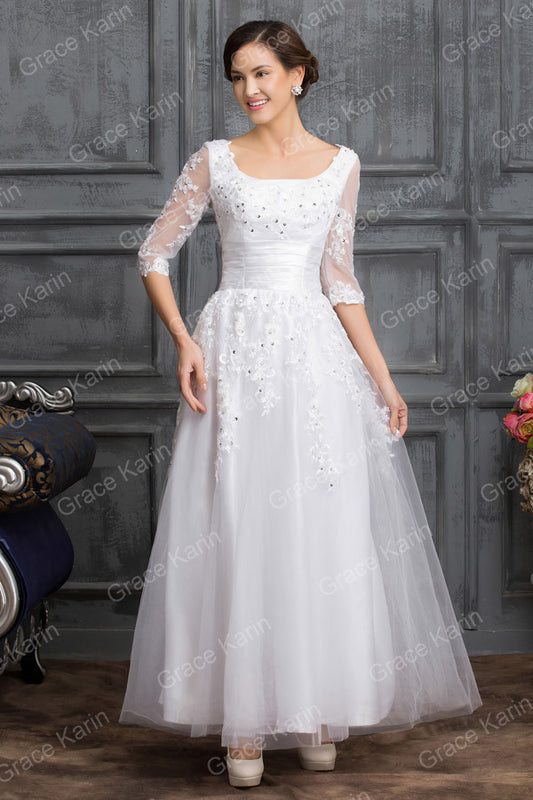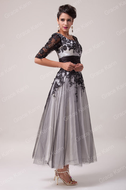 Grace Karin Elegant Long Lace Evening Dresses 2016 Half Sleeve Black White Champagne