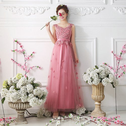 Pink Lace Chiffon Evening Dresses V Back A-Line Maxi Evening Gowns Women