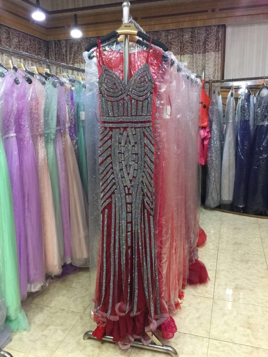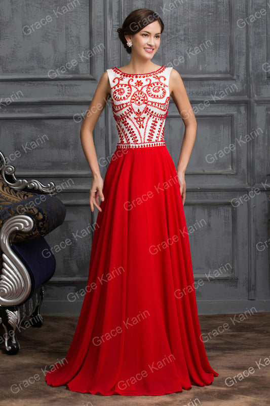Robe De Soiree Long Red Evening Dress Grace Karin Beads Sleeveless Chiffon Elegant