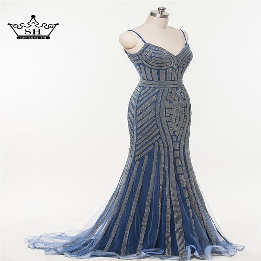 Robe De Soiree Evening Party Dress Real Photos Nude Color Tulle Crystal Royal Blue