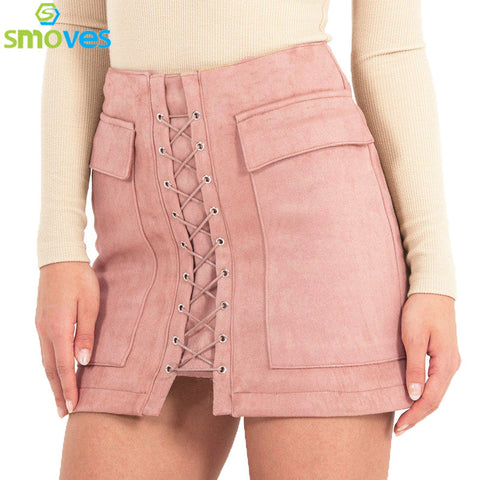 Smoves Women's Vintage High Waist External Pocket Tight Suede Lace Up