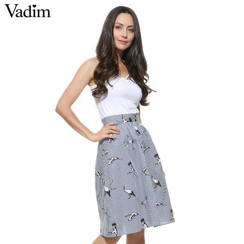 Women sweet birds print mid-calf striped skirts open stitch buttons design summer
