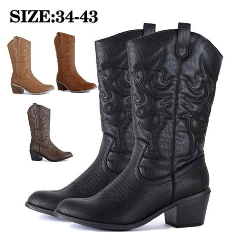 2022 Womens Cowboy Boots Bottine Femme Vintage Pointed Toe Mid Calf