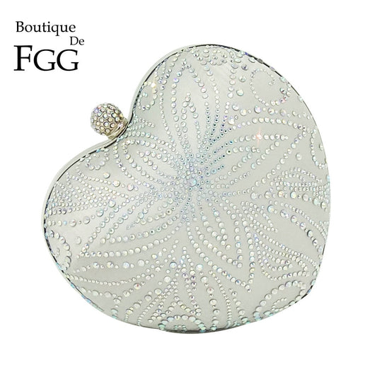 Boutique De FGG Silver Crystal Flower Women Heart Evening Clutch Bags Hardcase Metal Clutches Wedding Party