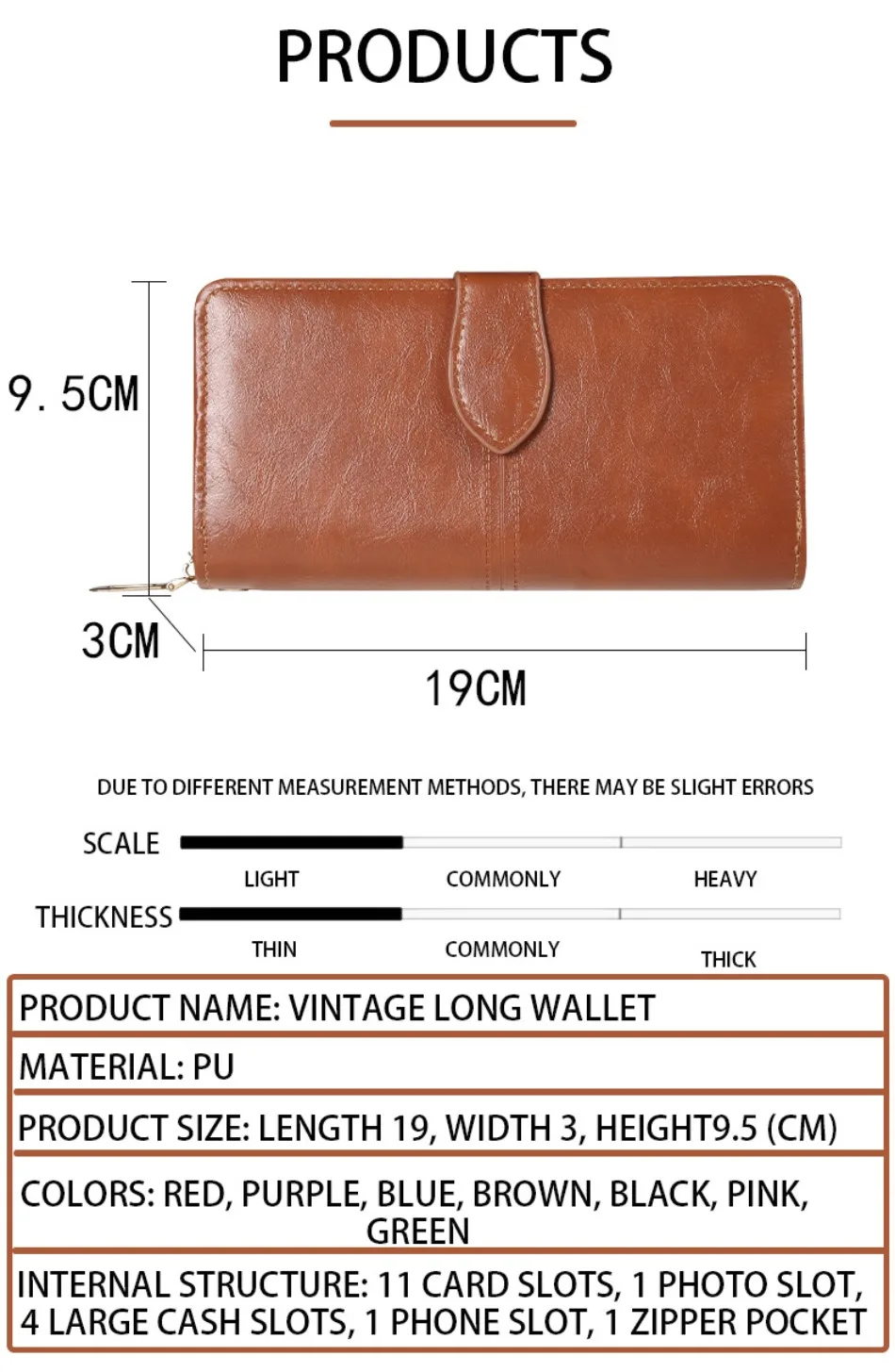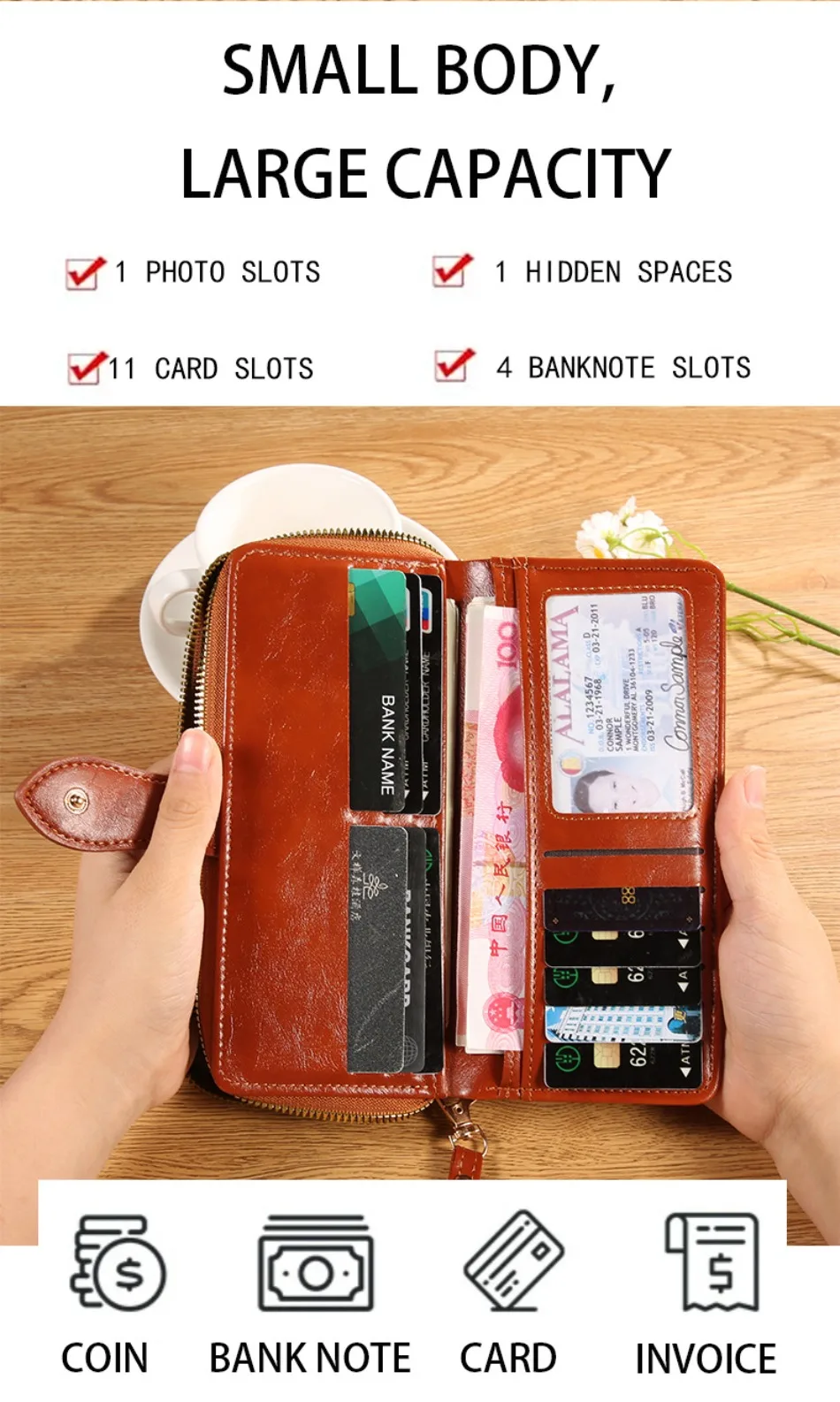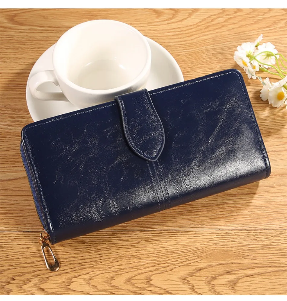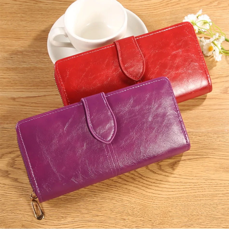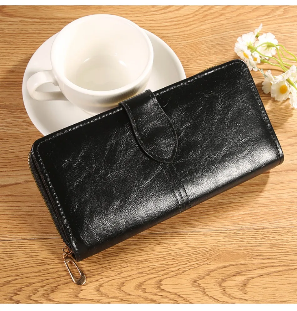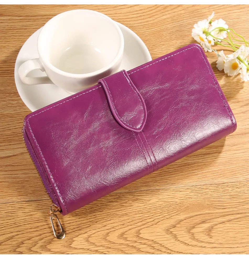 Oil Wax Leather Wallet, Mobile Phone Bag, Long Zipper Coin Bag, Women's Card Bag, Solid Color Large Bill Holder Wallet
