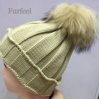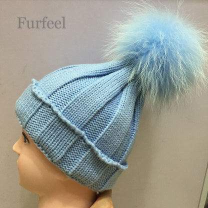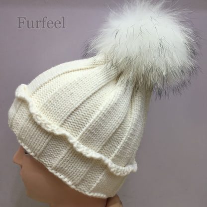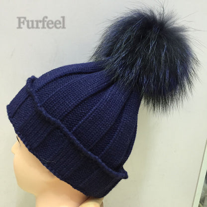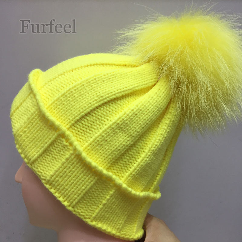 2016 kids Winter Hat 100% Real Raccoon Fur pom pom Ball Baby Beanies Cap Crochet Knitted Hats For Girls Boys