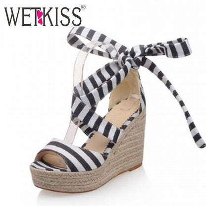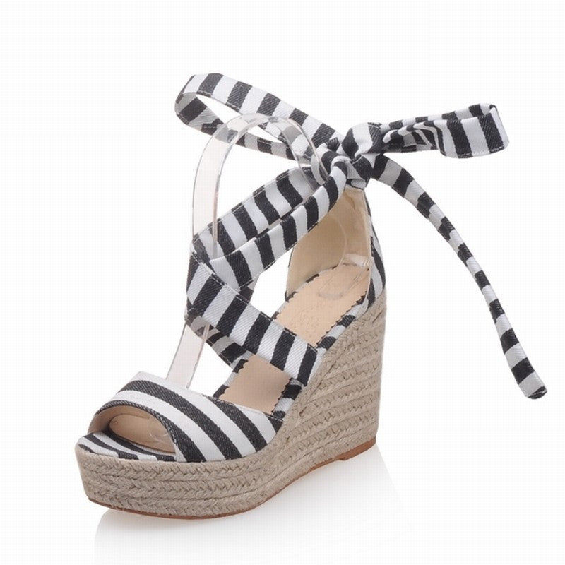 2016 New Arrival Lace up Women Sandals Gladiator Stripe Weave Wedges