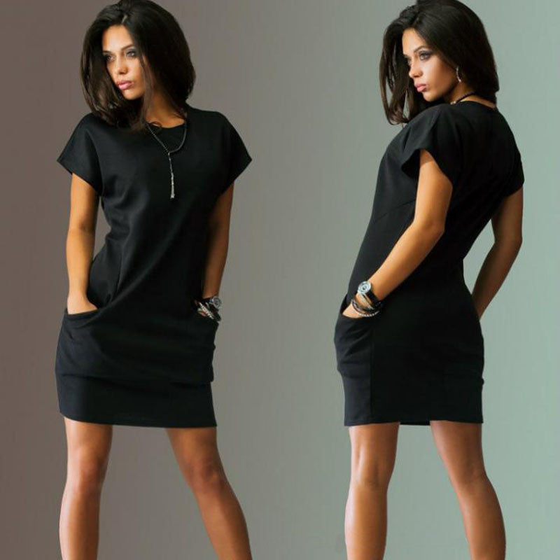 2016 Summer Dress Black Red Women Dress Short Sleeve Pockets Loose Casual