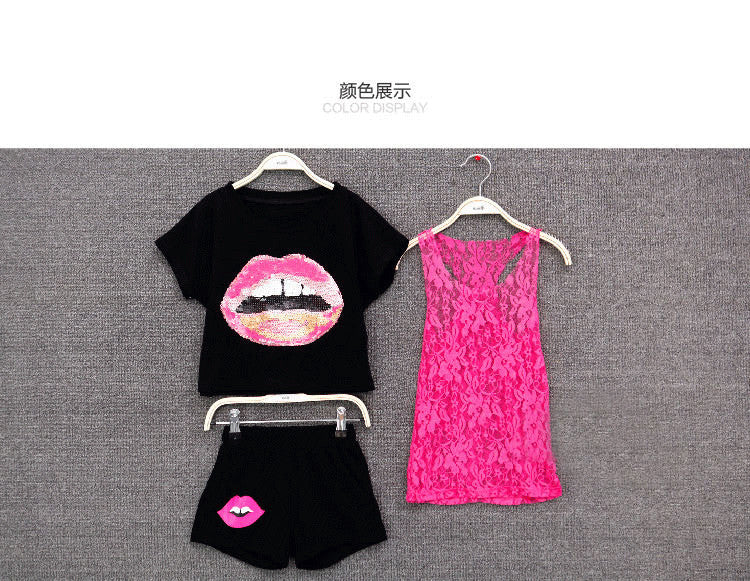 2016 summer fashion leisure sets girls Personalized lip print pattern short sleeve T-shirt