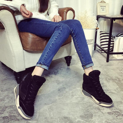 2016 Winter Spring New Korean Fashion Leather Lamb Wool Inner Height Increasing Wedge High Top Casual Shoes Woman Black Gray