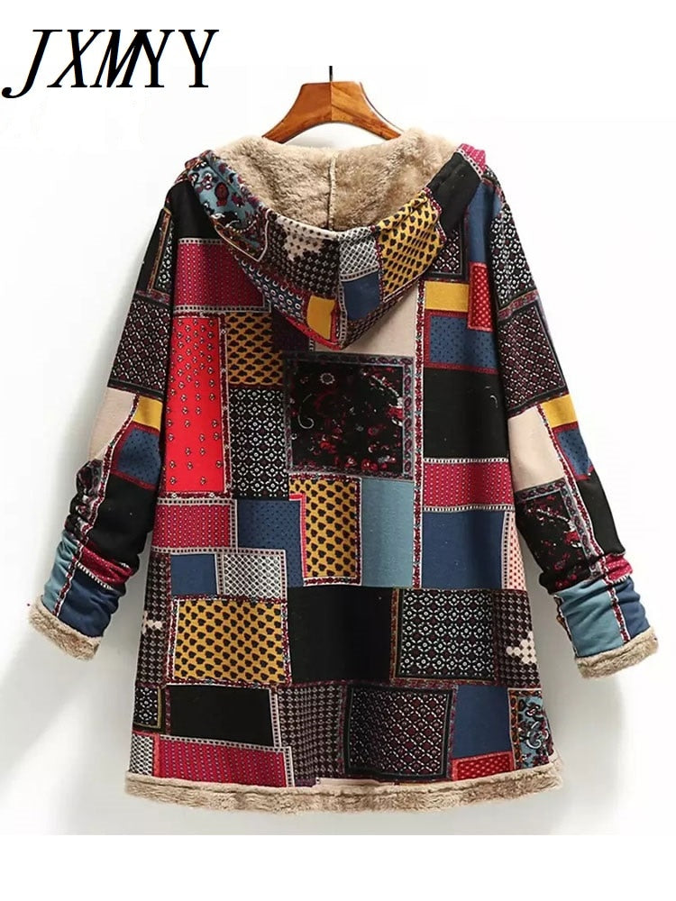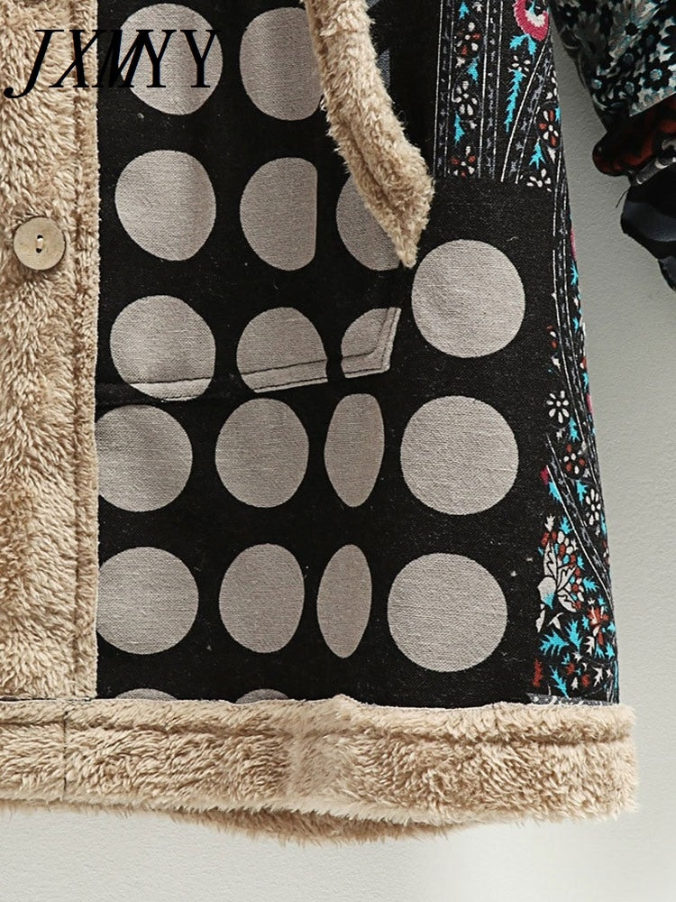Winter Vintage Women Coat Warm Printing Thick Fleece Hooded Long