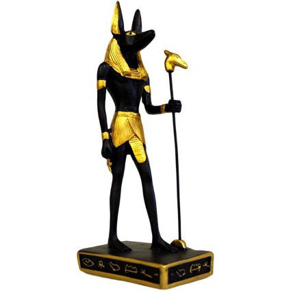Anubis God, H: 16.5 cm W: 4.5 cm D: 7 cm The Egyptian God Anubis holding an Ankh and Staff figurine is made from a resin, finished in gold paint with black and red details, the staff's shaft is made from metal and is removable.