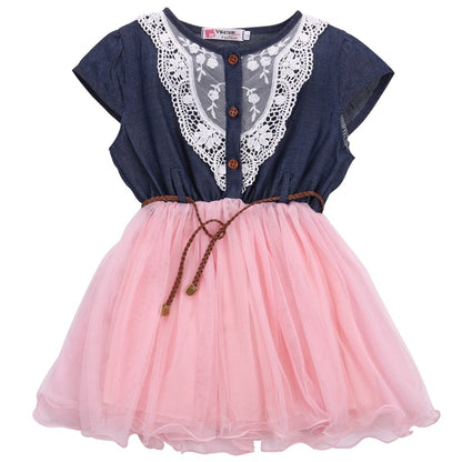 Princess Girls Baby Kids Lace Belt Denim Tulle Stitching Dresses Age 1-6Y