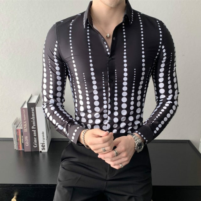 Fashion Point Striped Print Men Shirt Slim Fit Long Sleeve Casual Dress Shirts Streetwear