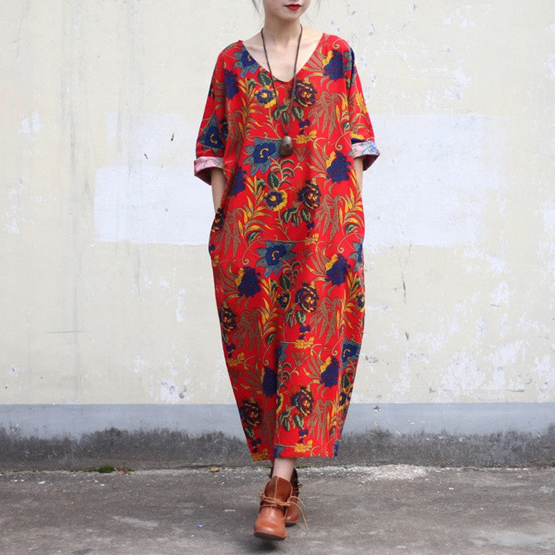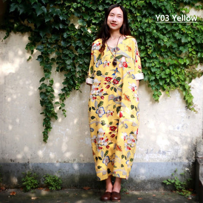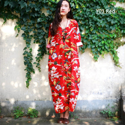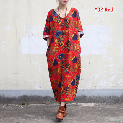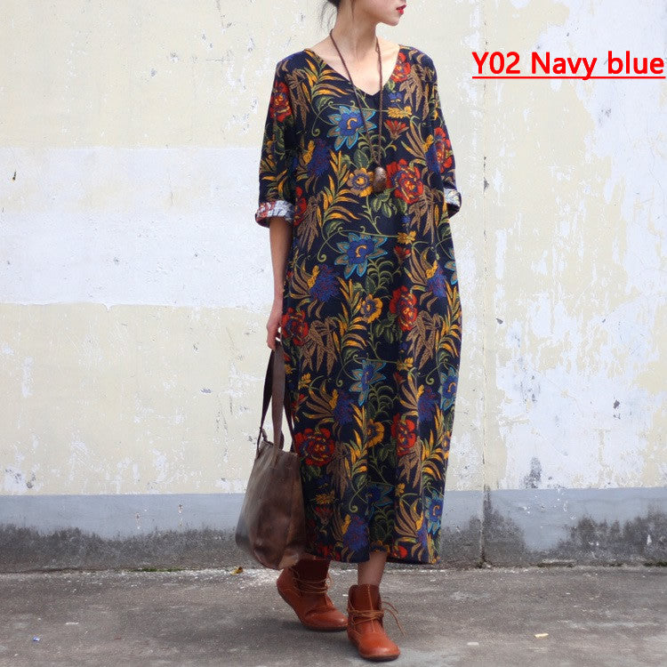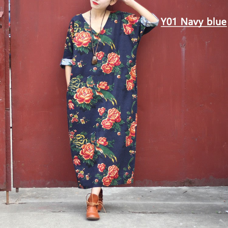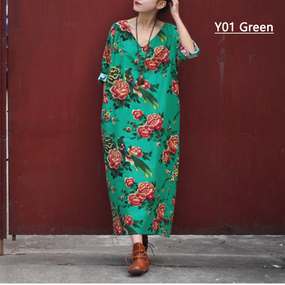 Cotton Linen Plus size Women Dress V-neck Flower print Long Summer Dress Original design
