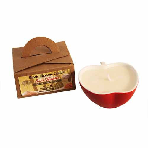 Apple shaped massage candle. Ingredients: Hydrated Soybean Wax, Jojoba Oil, Coconut Oil, Essential Oils: Apple, Lemon, Nutmeg. Each Erotic Massage Candle comes in a beautiful brown display box with information and how to use leaflet inside.