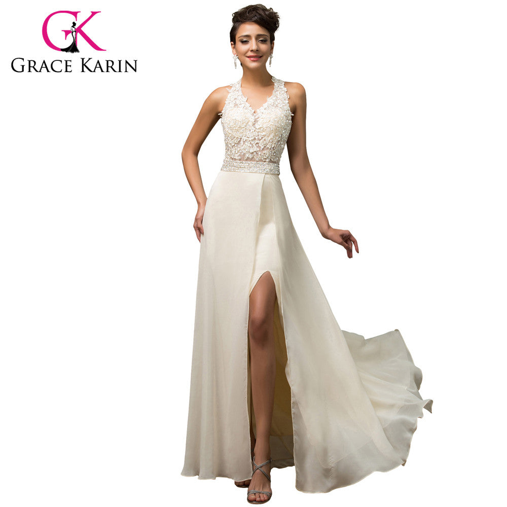 Halter Grace Karin Luxury Elegant Evening Dress Open Back Beige Sequin Beading