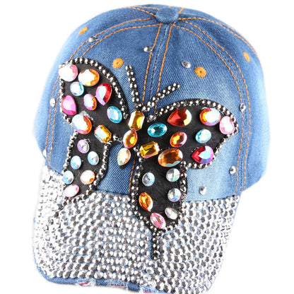 High quality Full Crystal Colorful Big Butterfly Denim Baseball Cap Bling Rhinestone hip hop Adjustable Snapback Hat for women