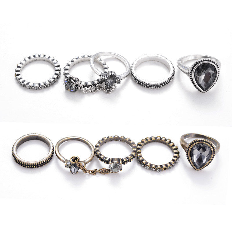 Latest design vintage style 5 pieces/set austrian crystal fashion rings silver mid finger rings for women men
