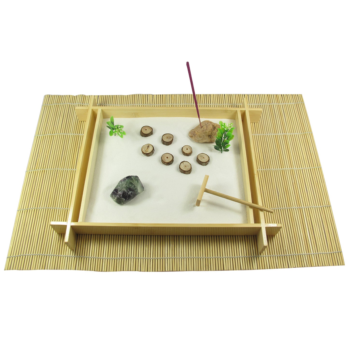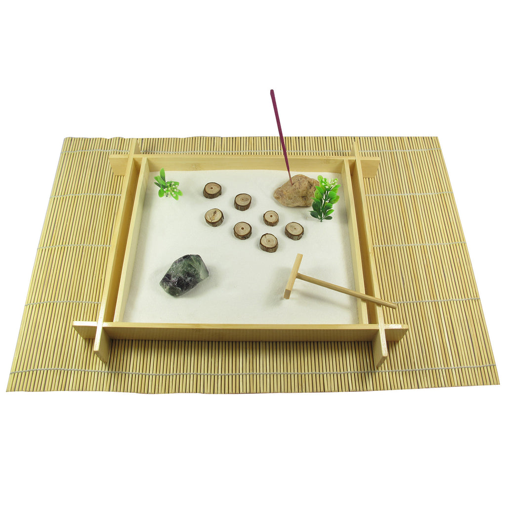 Contains: 1x bamboo tray, 1x bamboo rake, 1x bamboo mat, fine sand, 2x plant (plastic), incense stick and stone, wooden steps, mineral rock (rough flourite); Size: 30 x 3 x 14cm; Presentation box and information leaflet included.