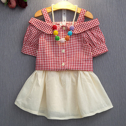 New 2016 Summer Children Kids Princess Strapless Short Sleeve Plaid Shirt+ Mini Skirt Girls Clothes Set Baby Girl Clothing Suits